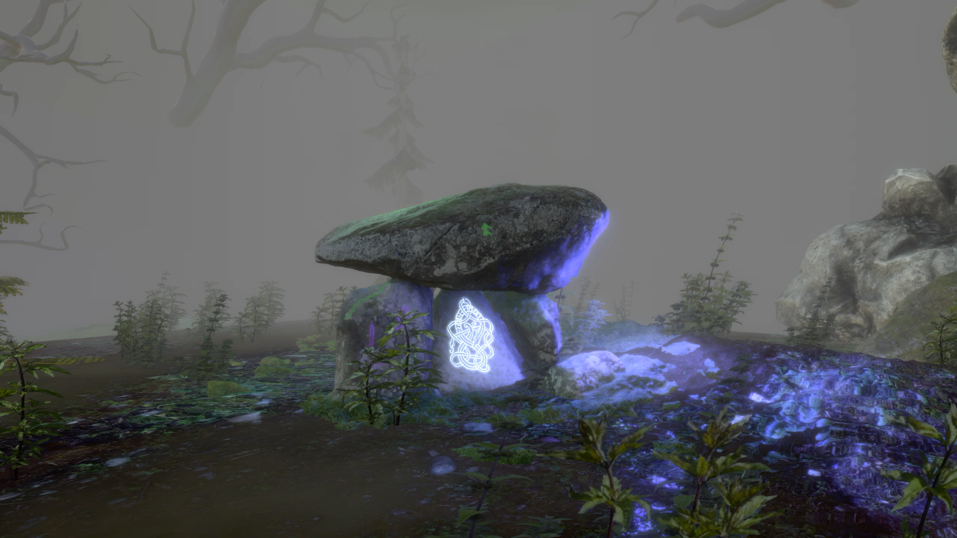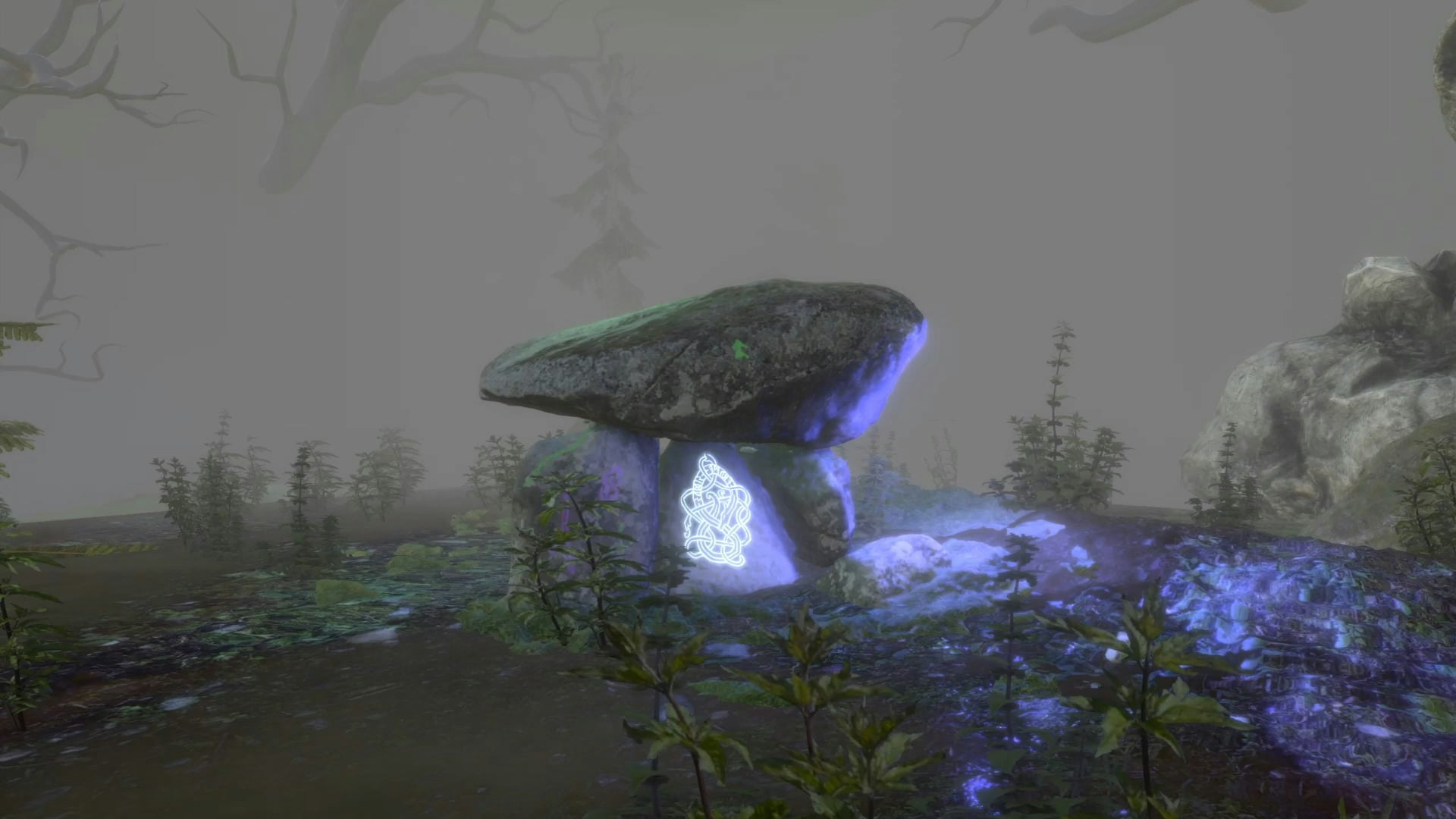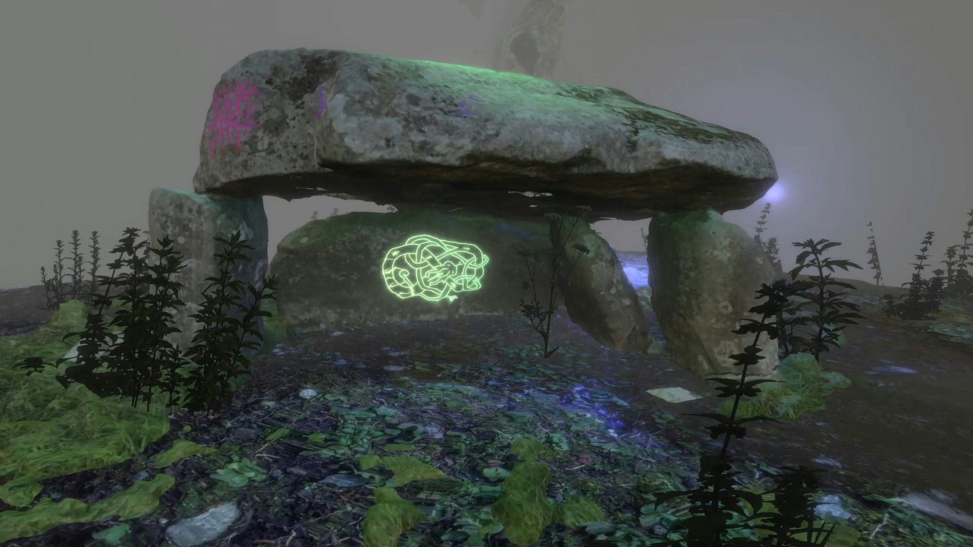 A Cairn, or Dolmen, is an ancient ritual burial site unique to Pre-Christian traditions in the United Kingdom. The Cairn exists as a link between the real world of the living and the mystical world of the dead, or the ‘Otherworld’ as this is referred to in folklore. The work is a mediation on this connection between worlds, and virtually recreates the Rhoslan Dolmen or Cefn Isaf in Gwynedd, Wales. Aimed at capturing the ambience and otherworldliness of the Dolmen and British wild spaces, Cairn exists within a wider, computer generated, mystical and foggy environment. Fog is a transient but constant occurrence within the British landscape and is a significant element of the ancient British cultural psyche. Fog was believed to act as a veil between worlds, and by entering a fog, one could find themself passing the threshold between realities.