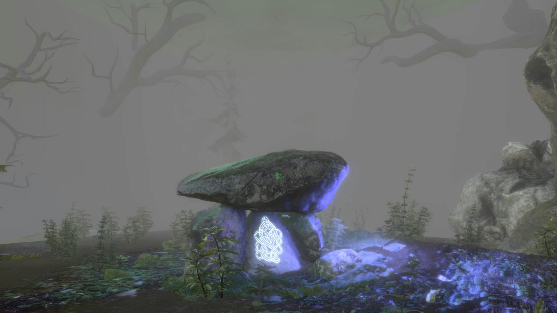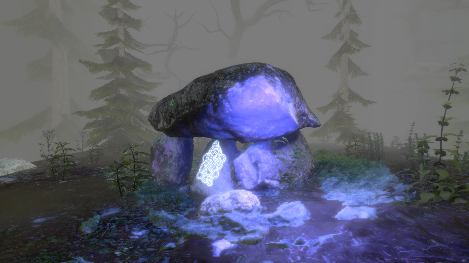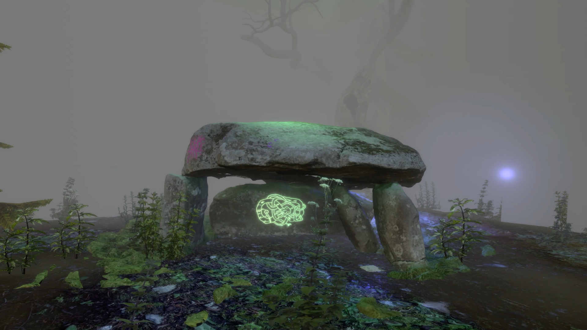 A Cairn, or Dolmen, is an ancient ritual burial site unique to Pre-Christian traditions in the United Kingdom. The Cairn exists as a link between the real world of the living and the mystical world of the dead, or the ‘Otherworld’ as this is referred to in folklore. The work is a mediation on this connection between worlds, and virtually recreates the Rhoslan Dolmen or Cefn Isaf in Gwynedd, Wales. Aimed at capturing the ambience and otherworldliness of the Dolmen and British wild spaces, Cairn exists within a wider, computer generated, mystical and foggy environment. Fog is a transient but constant occurrence within the British landscape and is a significant element of the ancient British cultural psyche. Fog was believed to act as a veil between worlds, and by entering a fog, one could find themself passing the threshold between realities.